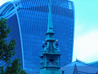 While in London we did the usual touristy things involving historical sight seeing. We toured the Tower Of London and saw the amazing Crown Jewels , as well as a fascinating armor collection going back to the Norman conquest in 1066.The stories and traditions are fascinating as you watch young soldiers standing guard in bright red uniform coats and traditional bear skin head covers.They are now carrying automatic British armaments of SA-80 designation which are unloaded during the day, but live ammo clips are very close at hand during emergencies. There are no such guards as "Ceremonial Guards", as all are in the regular British army and have been exemplary soldiers to be honored as Queen's guards or Tower Guards. The Beefeaters on the other hand are chosen from British Army ranks with at least 22 years active NCO service. Needless to say none of the guards are to be taken lightly.At one time the Tower of London hosted the Royal Menagerie , where over 60 exotic animals were kept for Royal Entertainment. Started in the 1200's by King John of Magna Charta fame, the zoo lasted for over 600 years. Polar bears ,lions , and tigers were kept as well as baboons which couldn't be confined due to their climbing skills. The only animals left are 6 Ravens ceremoniously kept for traditional purposes. All six wander the grounds at will, confined to the earth with clipped wings.There are wonderful life size animals on the site sculpted by Kendra Haste of wire. They look so real as to startle visitors.The legend of the Ravens says that the British Empire and the Tower of London will fall if the Ravens ever leave.The revelry of the Tower of London's past and historical significance is given a dose of reality as one can see the modern 41 story skyscraper named 30 St Mary Axe towering above the walls. Finished in 2003, the cylindrical tower looks like a space rocket towering over old London. Often called the Gherkin by Londoners, the building looked to many like a Pickle. It was featured in the Sharon Stone Thriller Basic Instinct 2.We